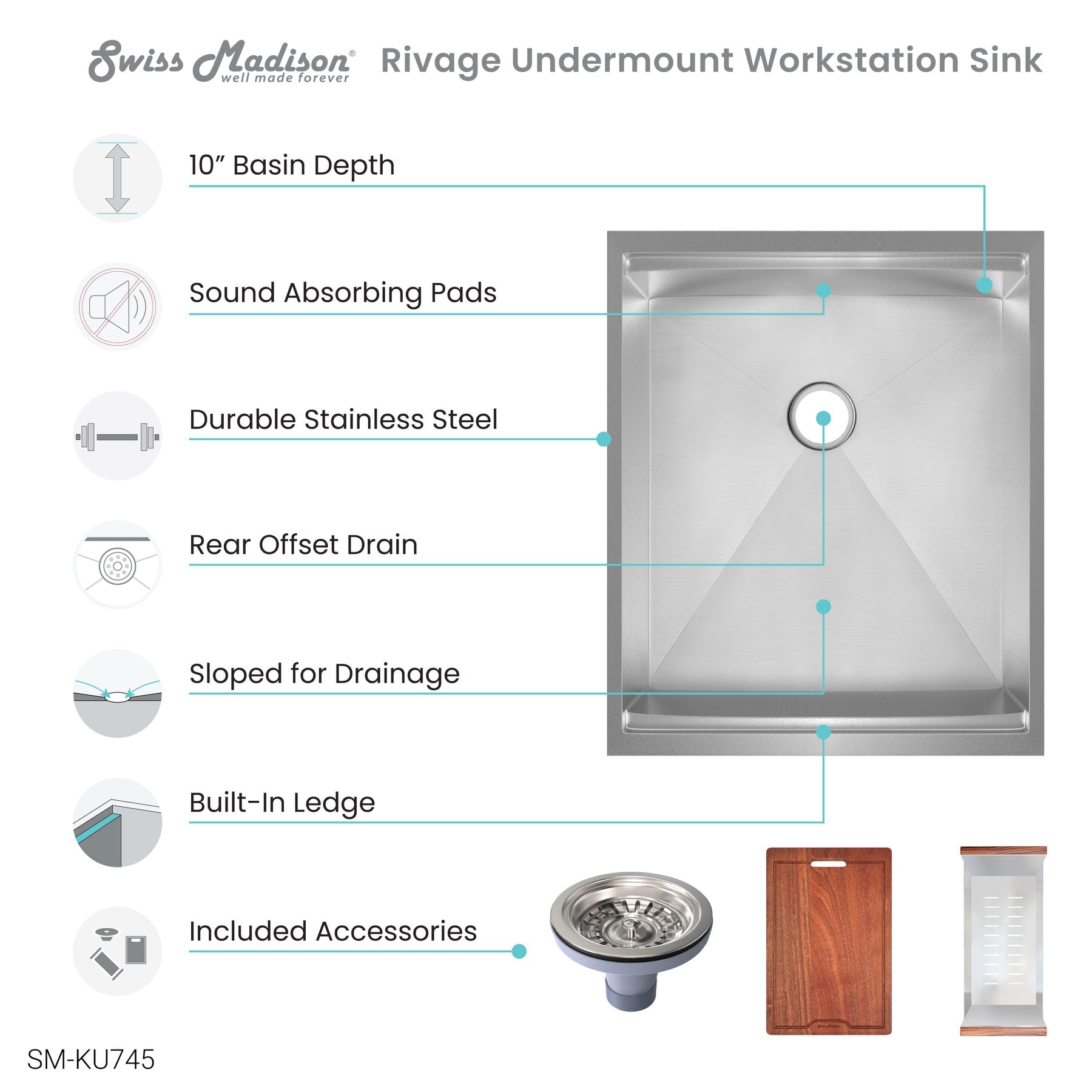 Rivage 15 x 19 Single Basin Undermount Kitchen Workstation Sink