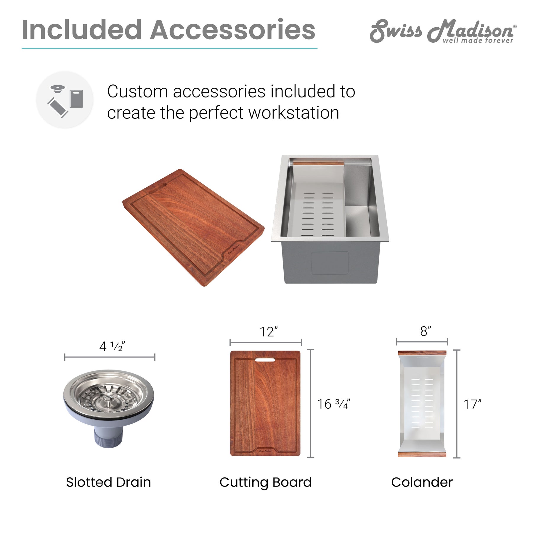 This Rivage Workstation Sink is the ultimate modern addition to any kitchen setting. From meal prep to cleanup, this stylish undermount single basin set comes with a strainer, colander, and cutting board, making your kitchen a streamlined workspace. Crafted with stainless steel, this product is durable and built to last. The deep bowl allows for uninterrupted space in washing and stacking dishes, along with other household tasks. Additionally, this product is stain and scratch resistant, along with being engineered to withstand high temperatures.