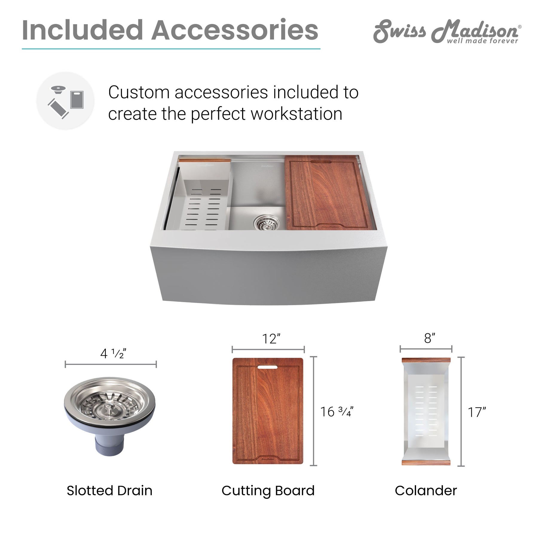 This Rivage Workstation Sink is the ultimate modern addition to any kitchen setting. From meal prep to cleanup, this stylish apron front single basin farmhouse set comes with a strainer, colander, and cutting board, making your kitchen a streamlined workspace. Crafted with stainless steel, this product is durable and built to last. The deep bowl allows for uninterrupted space in washing and stacking dishes, along with other household tasks. Additionally, this product is stain and scratch-resistant, along with being engineered to withstand high temperatures.