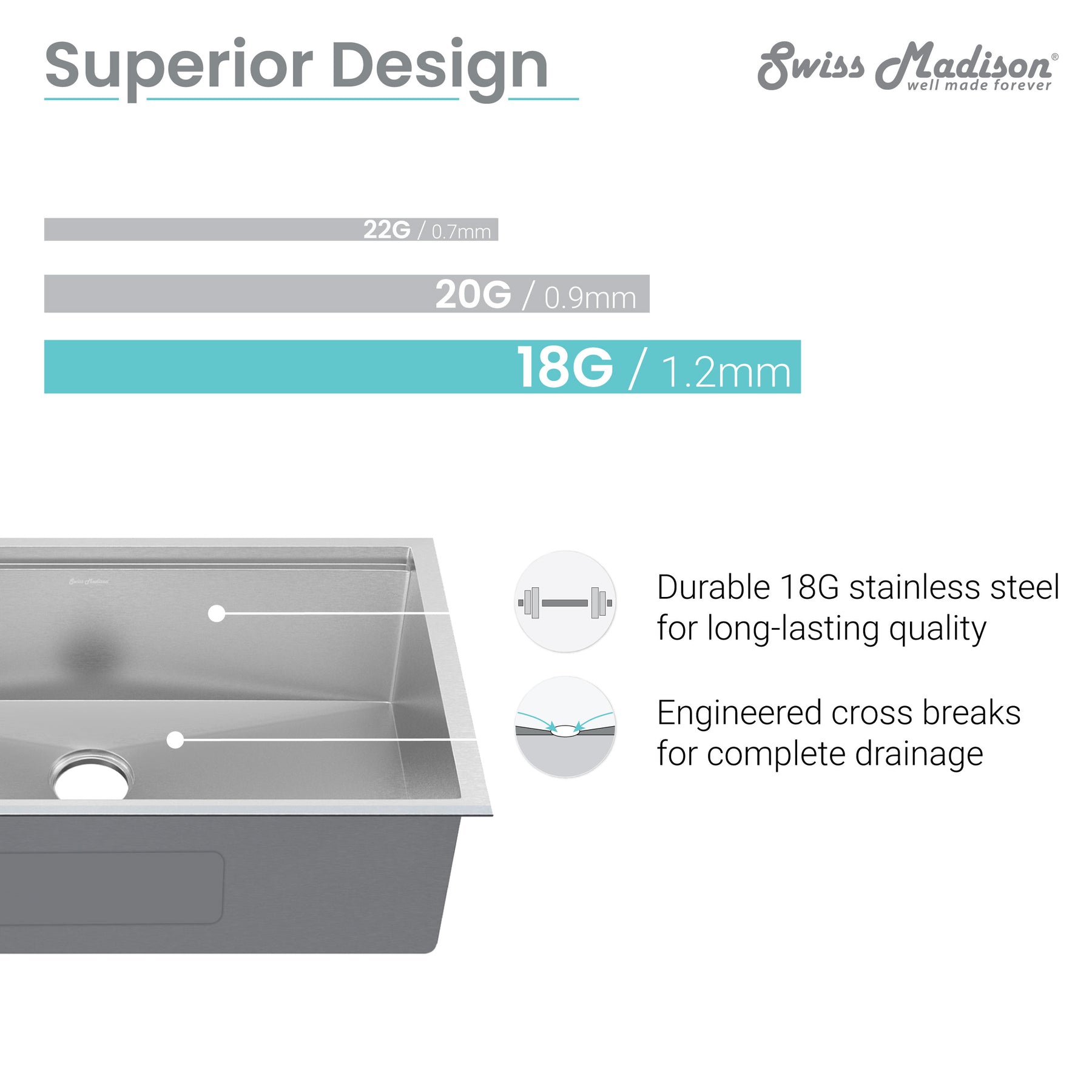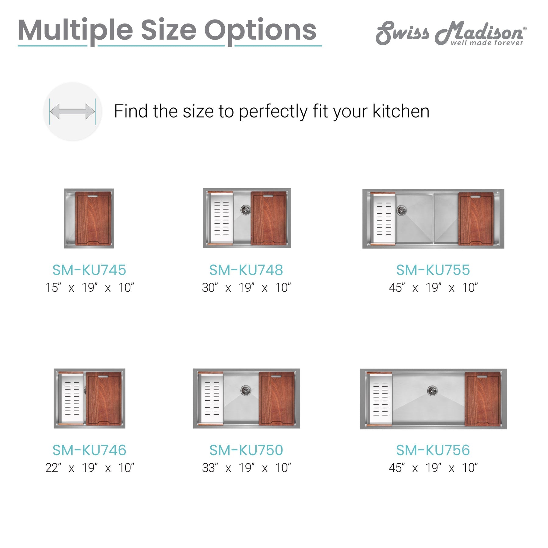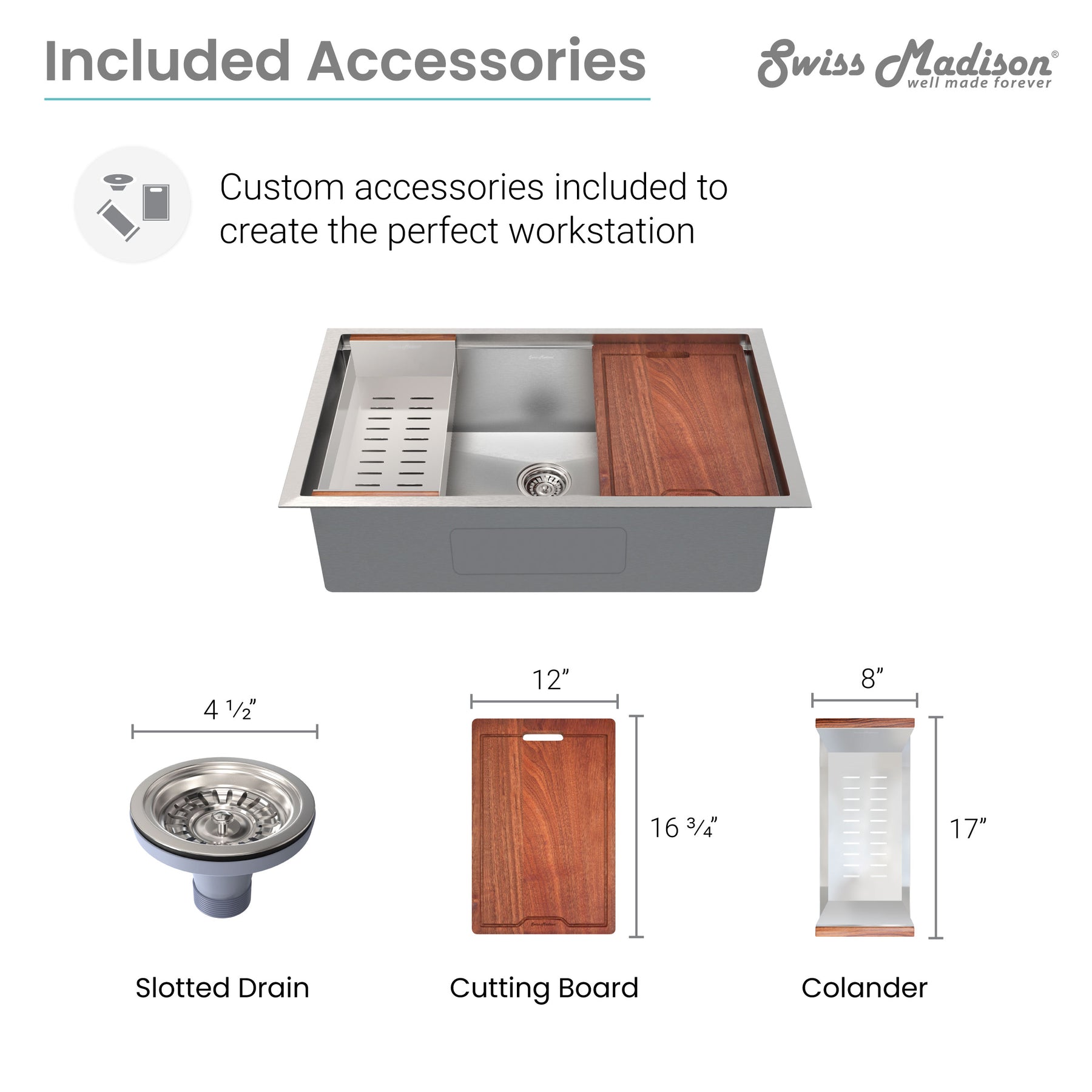 This Rivage Workstation Sink is the ultimate modern addition to any kitchen setting. From meal prep to cleanup, this stylish undermount single basin set comes with a strainer, colander, and cutting board, making your kitchen a streamlined workspace. Crafted with stainless steel, this product is durable and built to last. The deep bowl allows for uninterrupted space in washing and stacking dishes, along with other household tasks. Additionally, this product is stain and scratch resistant, along with being engineered to withstand high temperatures.