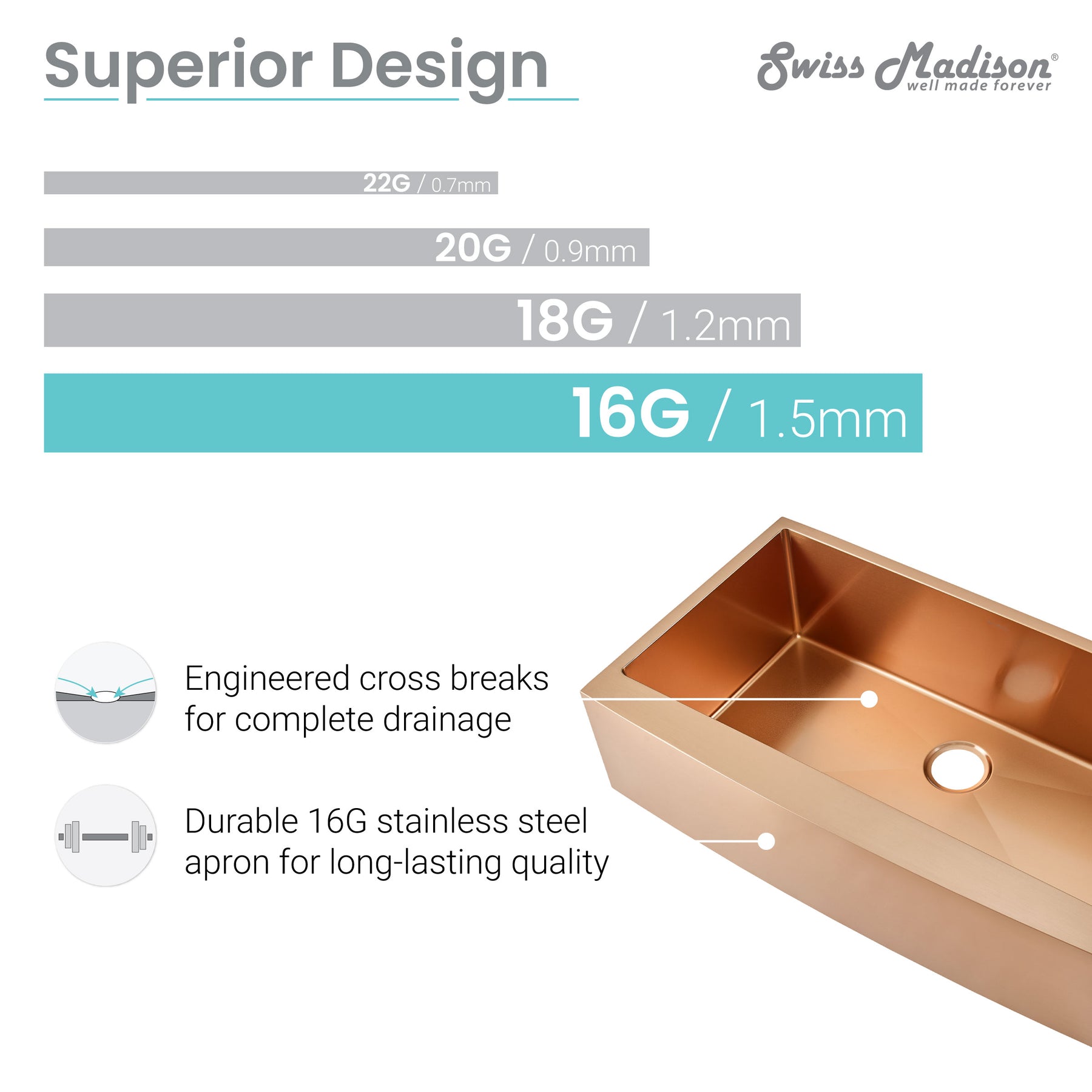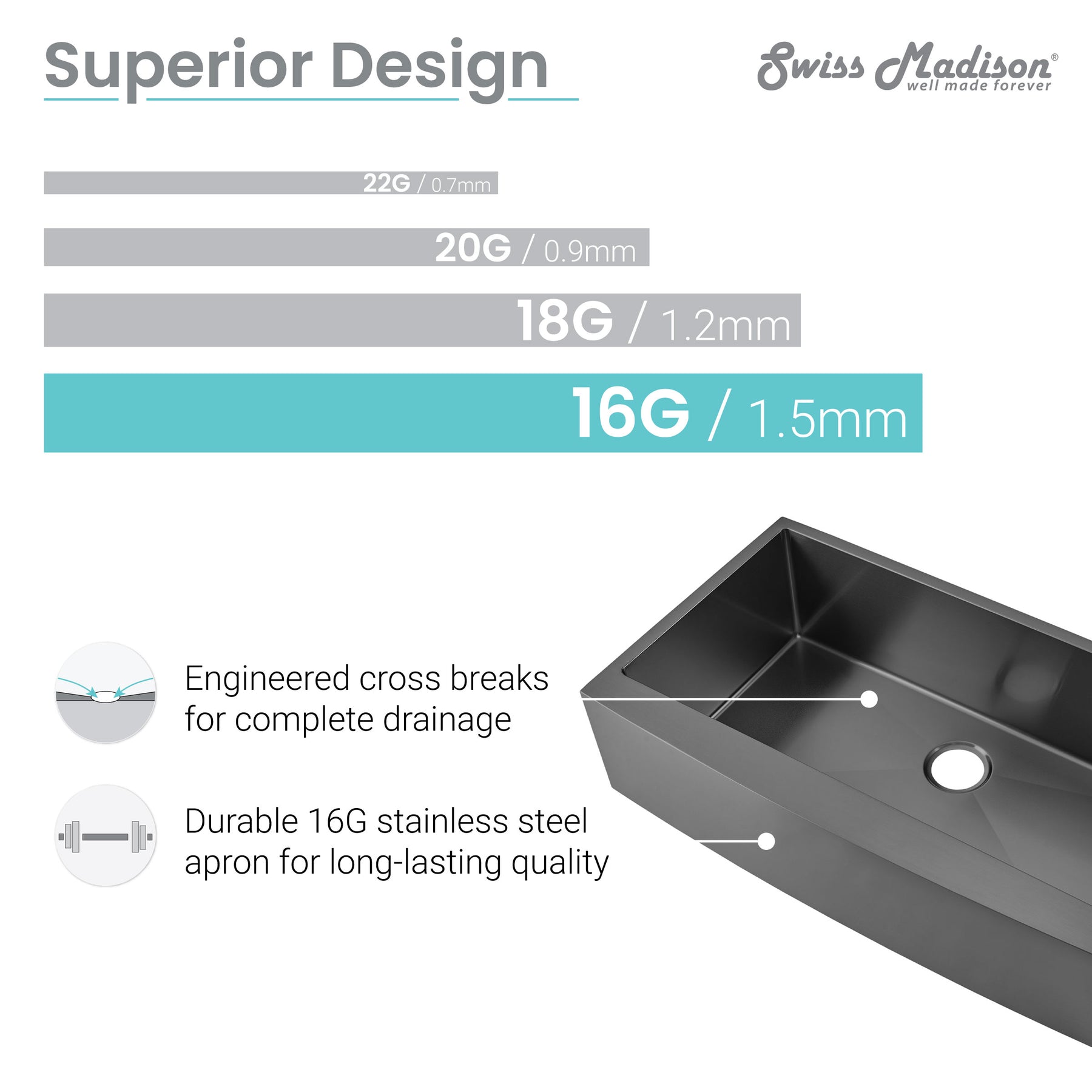 - Gently sloping basin with engineered groves to boost draining