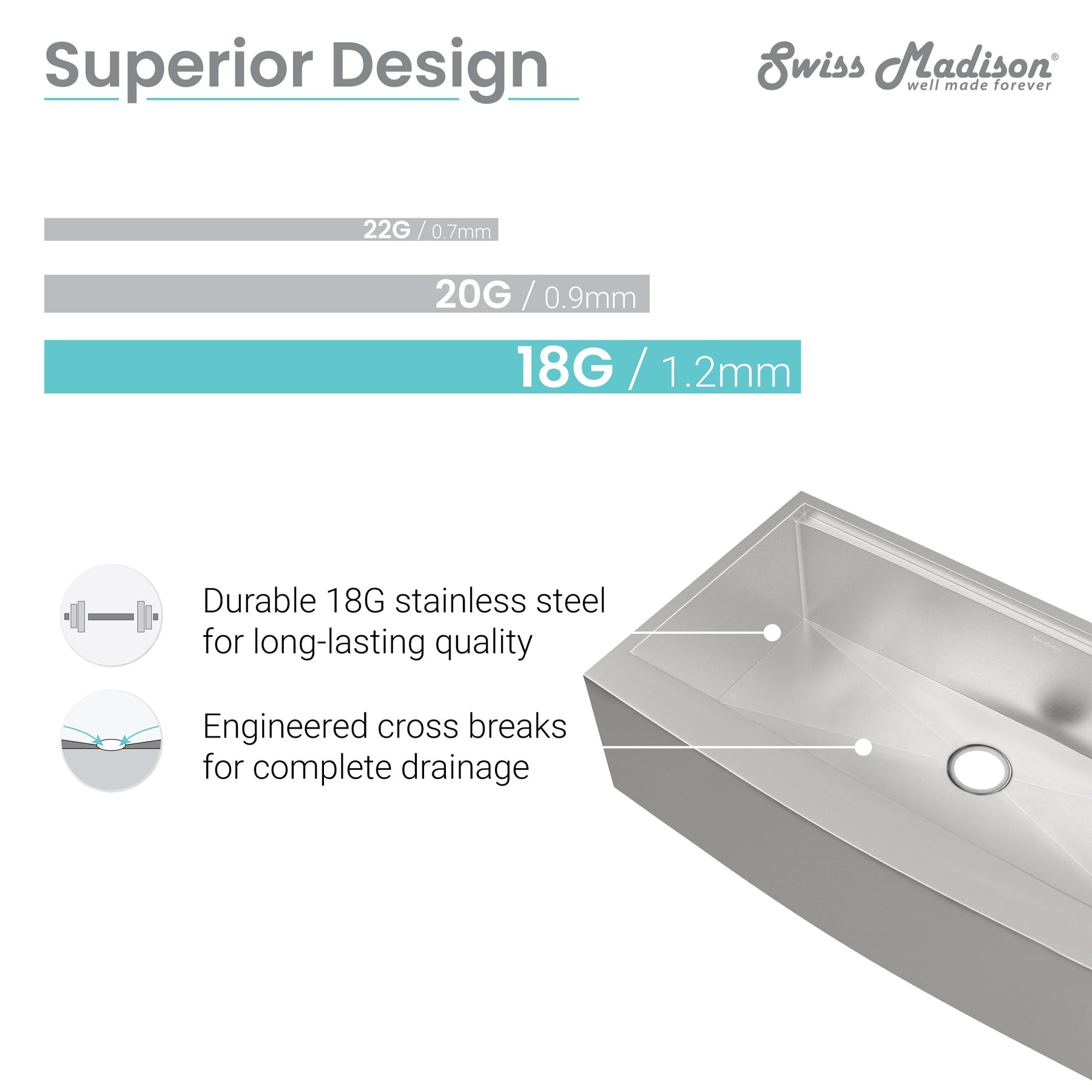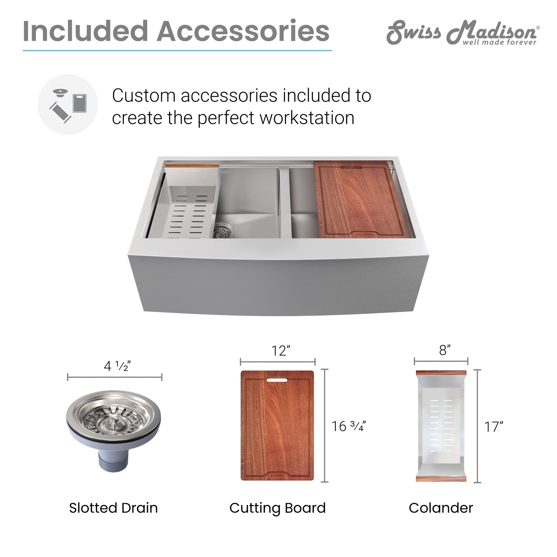 This Rivage Workstation Sink is the ultimate modern addition to any kitchen setting. From meal prep to cleanup, this stylish apron front single basin farmhouse set comes with a strainer, colander, and cutting board, making your kitchen a streamlined workspace. Crafted with stainless steel, this product is durable and built to last. The deep bowl allows for uninterrupted space in washing and stacking dishes, along with other household tasks. Additionally, this product is stain and scratch resistant, along with being engineered to withstand high temperatures.