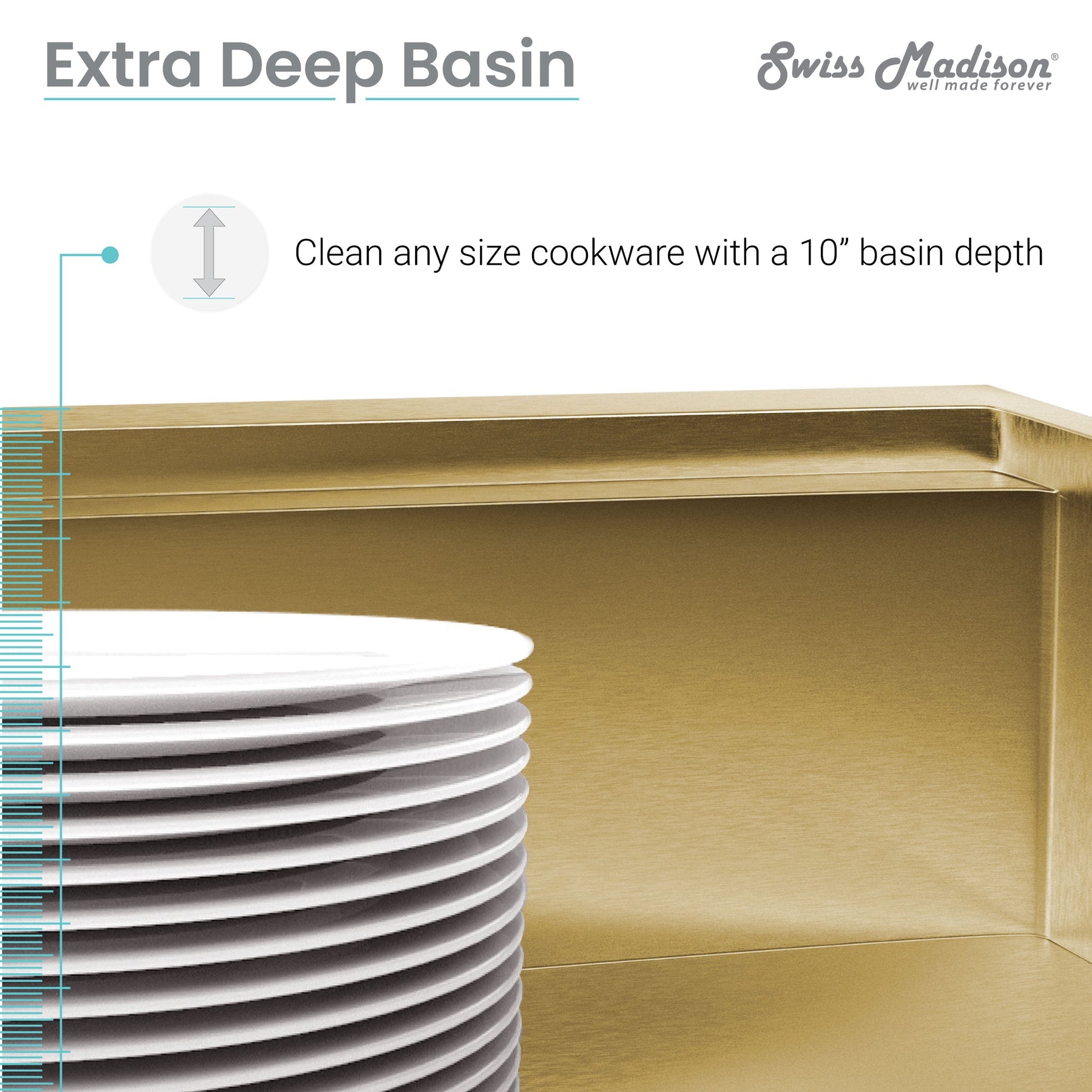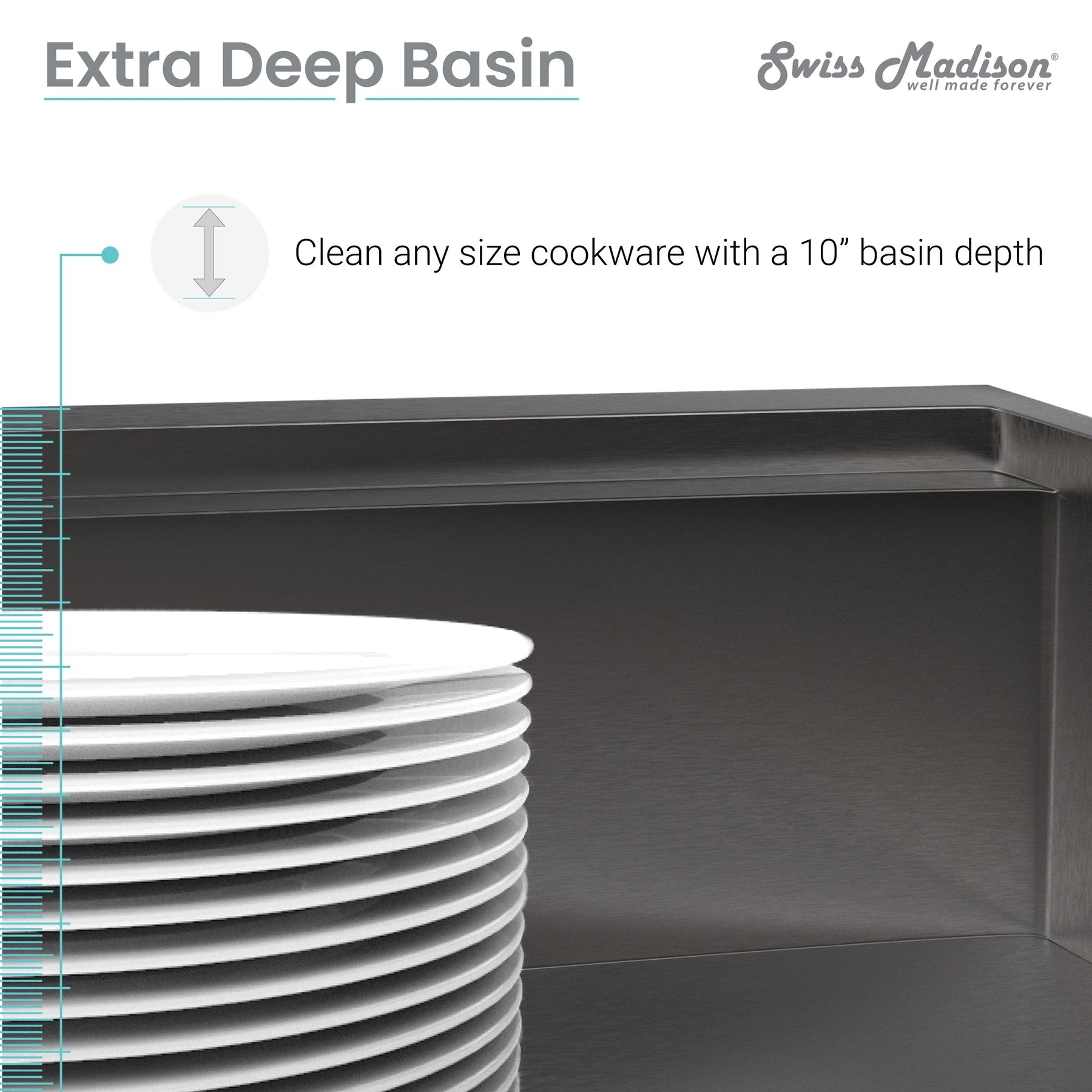 The Tourner Farmhouse Kitchen Sink is a stylish single basin sink that is a perfect addition to any kitchen setting. Crafted with stainless steel, this product is durable and built to last. This workstation includes a strainer, cutting board, colander, dryer rack, and bottom grid, allowing for efficiency from meal preparation to clean up. The deep bowl allows for uninterrupted space in washing and stacking dishes. Additionally, this sink’s PVD finish helps prevent stains and is scratch-resistant, along with being engineered to withstand high temperatures.